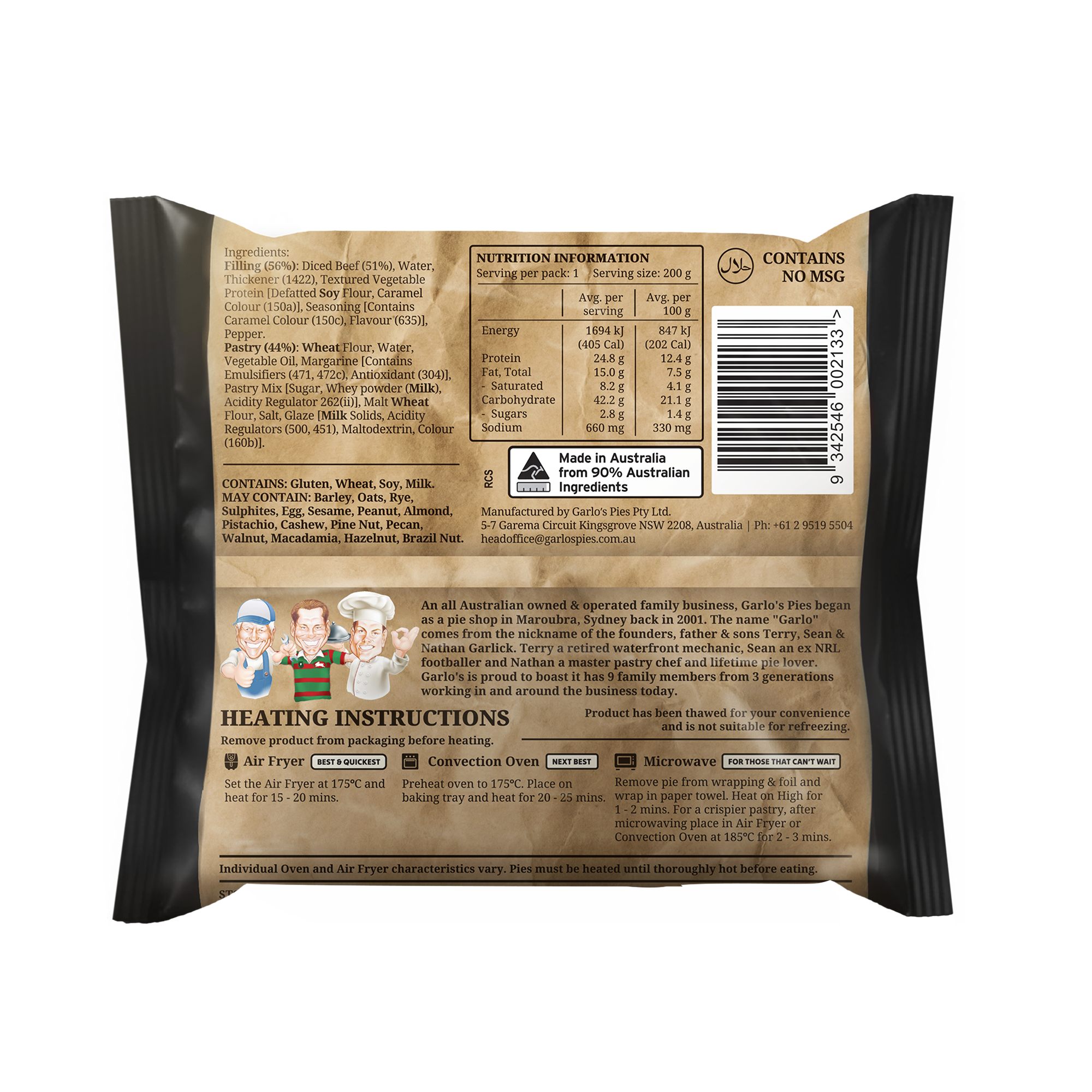 Preheat oven to 175°C. Product can be heated in or out of packaging. If Refrigerated heat for 20 – 25 mins. If Frozen heat for 35 – 45 mins. Heat until thoroughly hot before eating.
