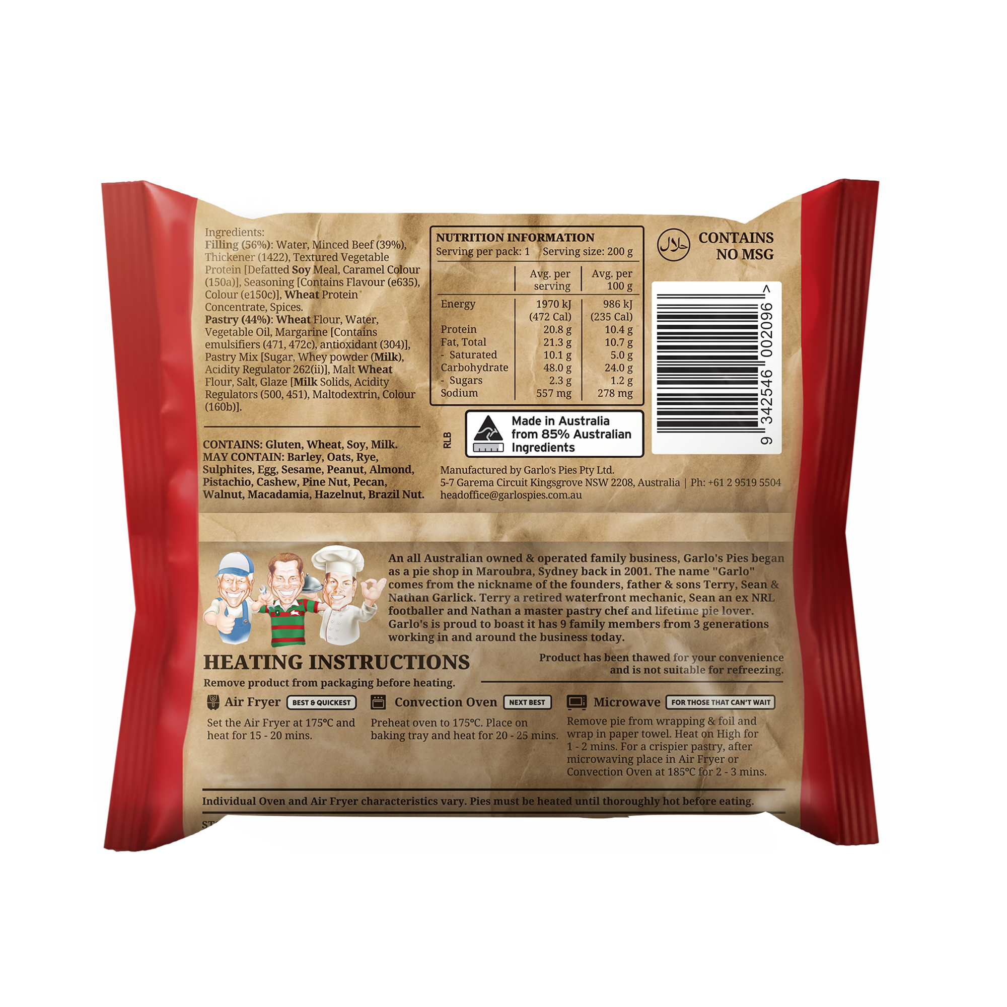 Preheat oven to 175°C. Product can be heated in or out of packaging. If Refrigerated heat for 20 – 25 mins. If Frozen heat for 35 – 45 mins. Heat until thoroughly hot before eating.