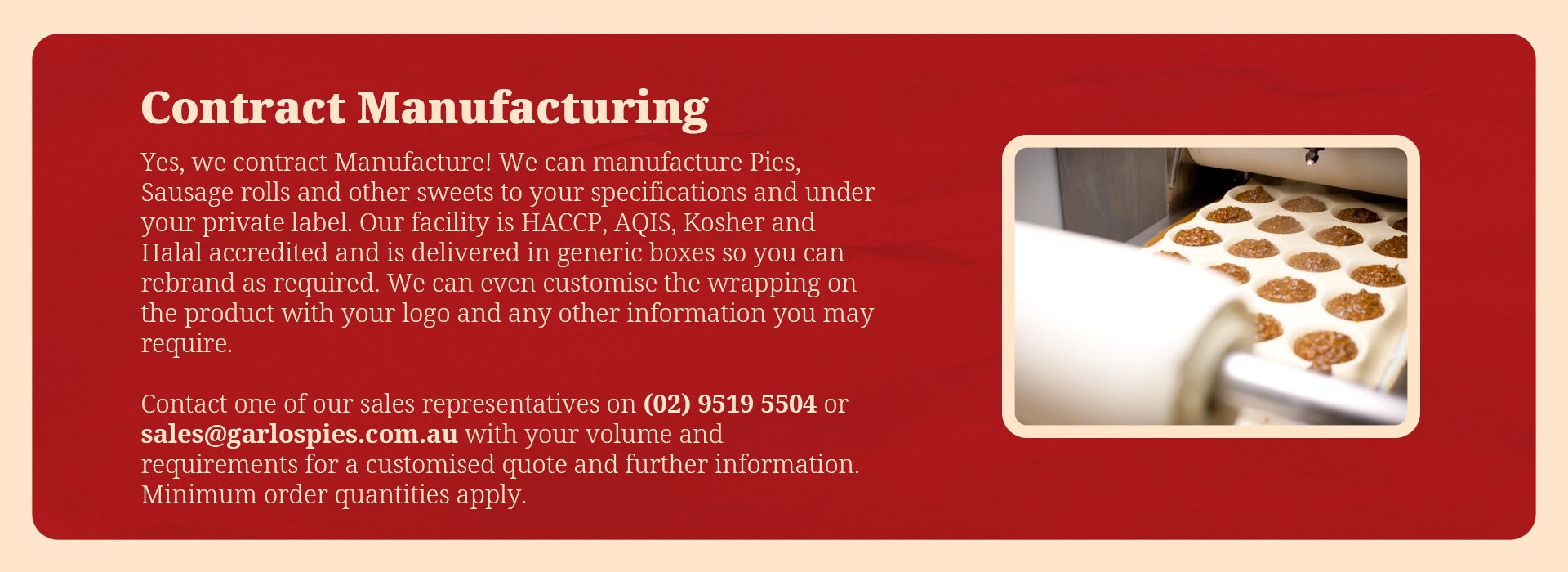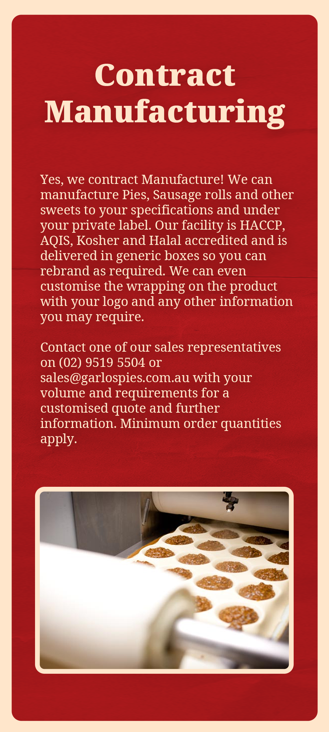 You can call us on (02) 9519 5504 or email us at sales@garlospies.com.au